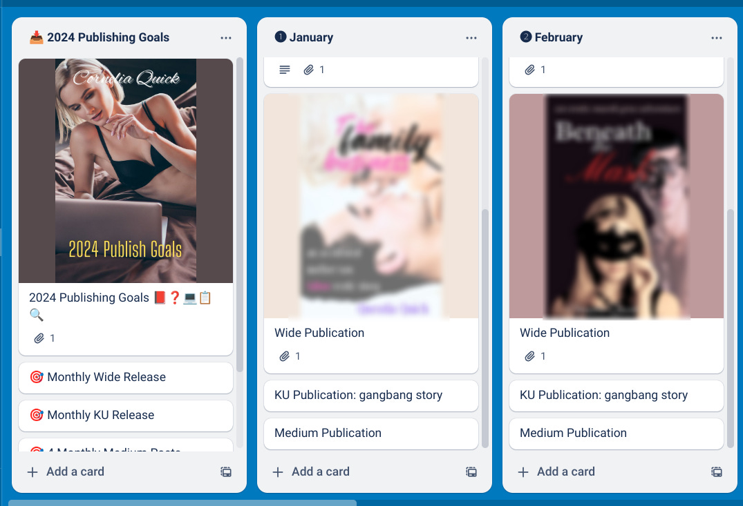 For 2024, I want to apply some of what I learned to find more success in both the writing and the selling of smut. To that end, I have turned again to my friend Trello, which I use for my publishing pipeline overview, to put together a publishing goals pipeline.