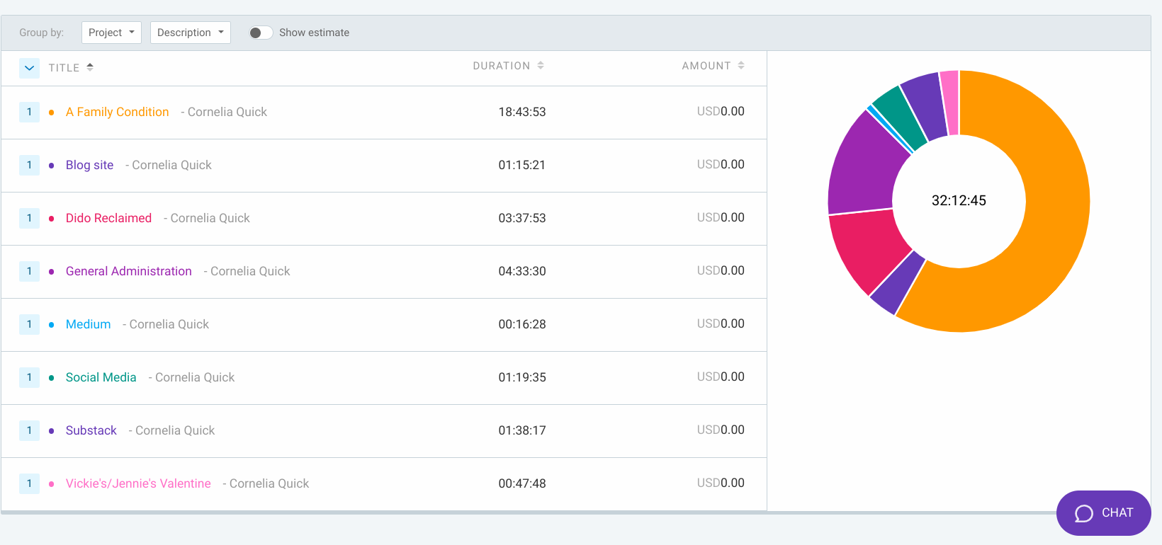 Clockify lets you create projects, and tasks within projects, against which to track your time. I’ve created projects for each of my works in progress, with tasks of “Drafting”, “Editing”, “Covers”, and “Publishing”, and also “General Admin”, “Social Media”, “Medium”, “Substack”, and “Blog” projects with their own tasks. Since I try to use the Pomodoro Method to avoid too much multitasking, it’s relatively easy to fit the habit of starting and stopping the timer as I switch from task to task. I want the buckets of time to be relatively big: I could parse the “General Admin” into a lot of fine slices, for example, but I would probably end up spending more time tracking time than actually doing tasks, so that project consists of" “Newsletter”, “Sales Analysis”, and “Planning” buckets.